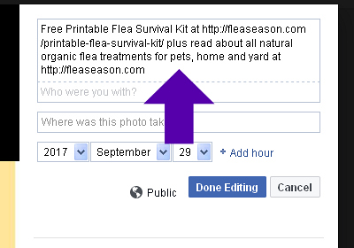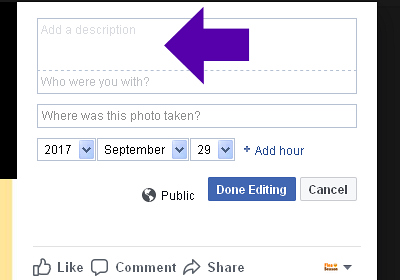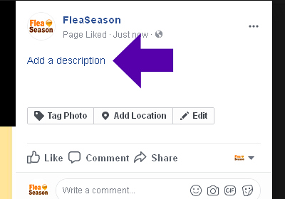When a person visits your Facebook page and clicks on your Cover Photo, the photo will open up to display a Description.