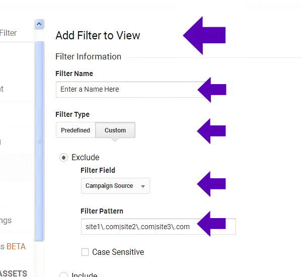 Under “Exclude” > “Filter Field” choose: “Campaign Source”.