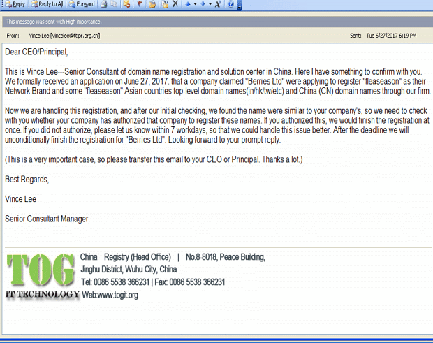 - The Sender identifies themselves as a "domain name registration and solution center in China".