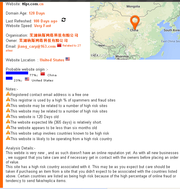 We ran the domain associated with the Email (ttipr.com.cn) through ScamAdvisor. The screenshot below displays warnings about how this domain is related to multiple High Risk Sites: