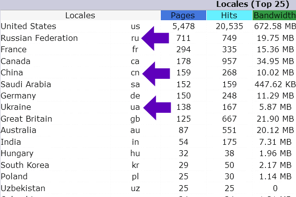 For this example, the “ru” which is Russian Federation, the “cn” which is China, and the “ua” which is Ukraine - are three countries we know are not meaningful traffic to this example website: