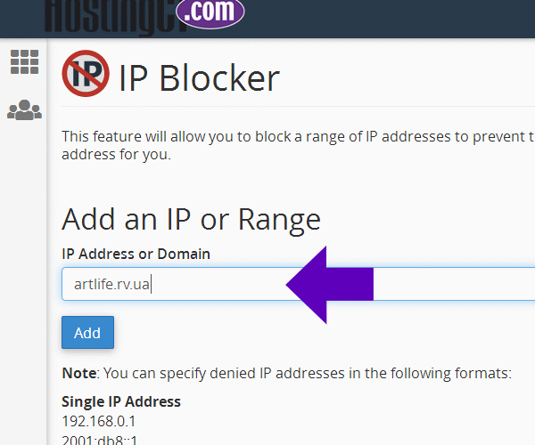 Copy the URLs you want to Block, and enter (one by one) into the “Add an IP or Range” box, then Click “Add”: