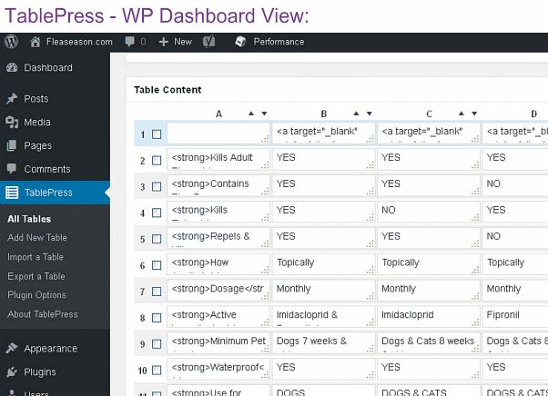Once installed, the TablePress selection button will display in the Left column of the Dashboard. Easy to set up a new table or edit an existing table.