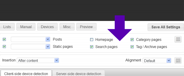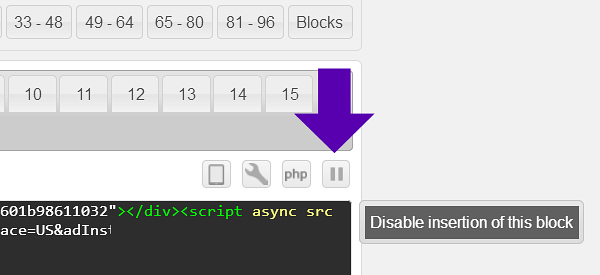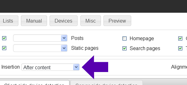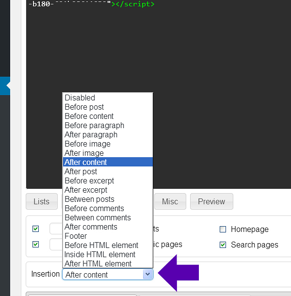 Click the “Insertion” Down Arrow to assign where the Ad code displays: