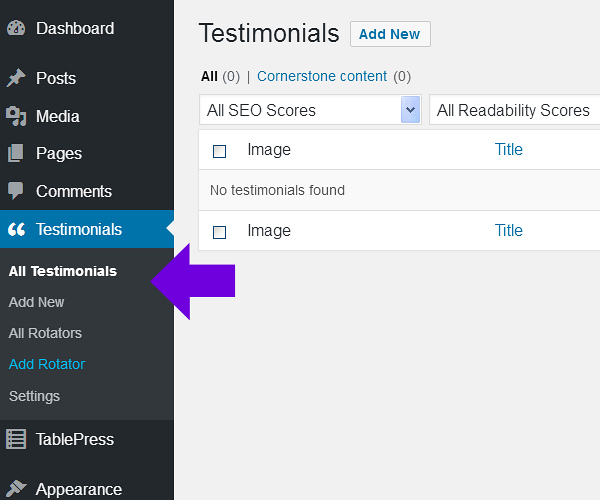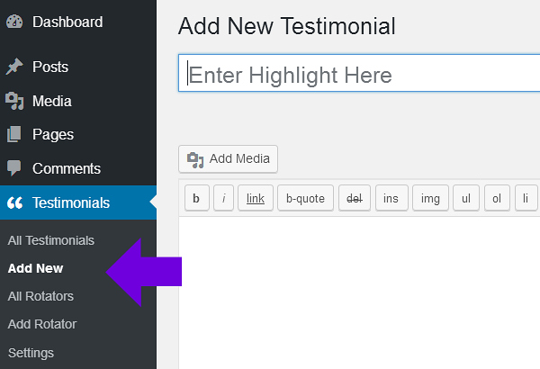 Locate “Testimonials in the Left navigational column, then Click “Add New”.