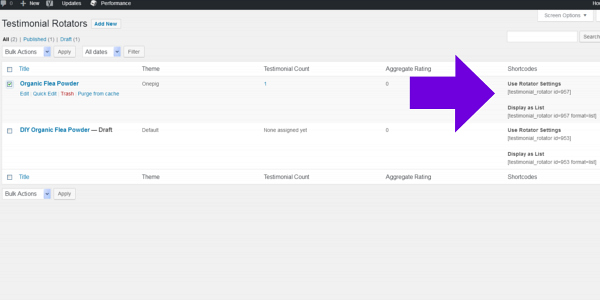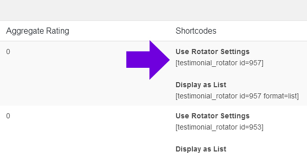 Select the Rotator you want to work with. The dedicated shortcode for each rotator will be listed to the far Right: