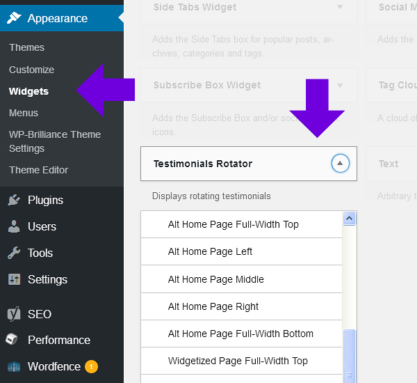 You can also copy and paste into a widget. To do this, go into: Appearance > Widgets, locate the Testimonial Rotator Widget, then add to your chosen Widget location:
